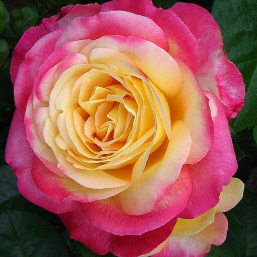 Ефектний чайно-гібридний сорт із великими (12–15 см) густомахровими квітками вершково-жовтого кольору з малиновою облямівкою.